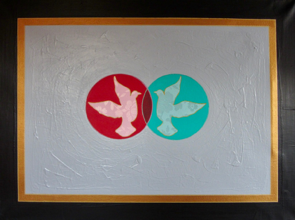 Fari and Varga Hosseini, Colour Blind Lovers (2016), synthetic polymer paint, polyvinyl acetate, paper, and metallic marker on canvas, 75 cm X 100 cm, collection of the artists.