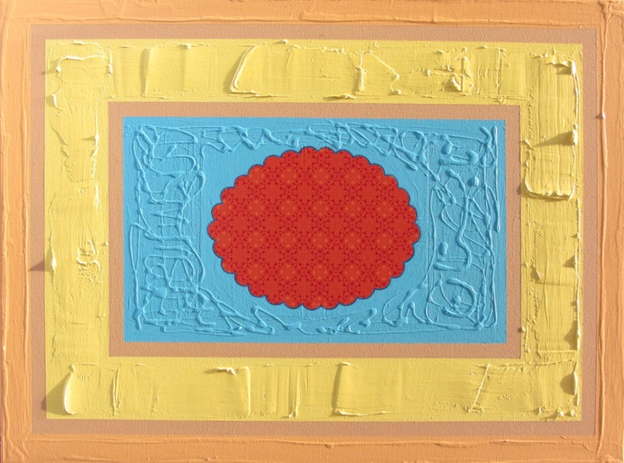 Fari and Varga Hosseini, Tangerine Summer (2017), synthetic polymer paint, paper, polyvinyl acetate, moulding paste, and metallic marker on canvas, 75 cm X 100 cm, collection of the artists.