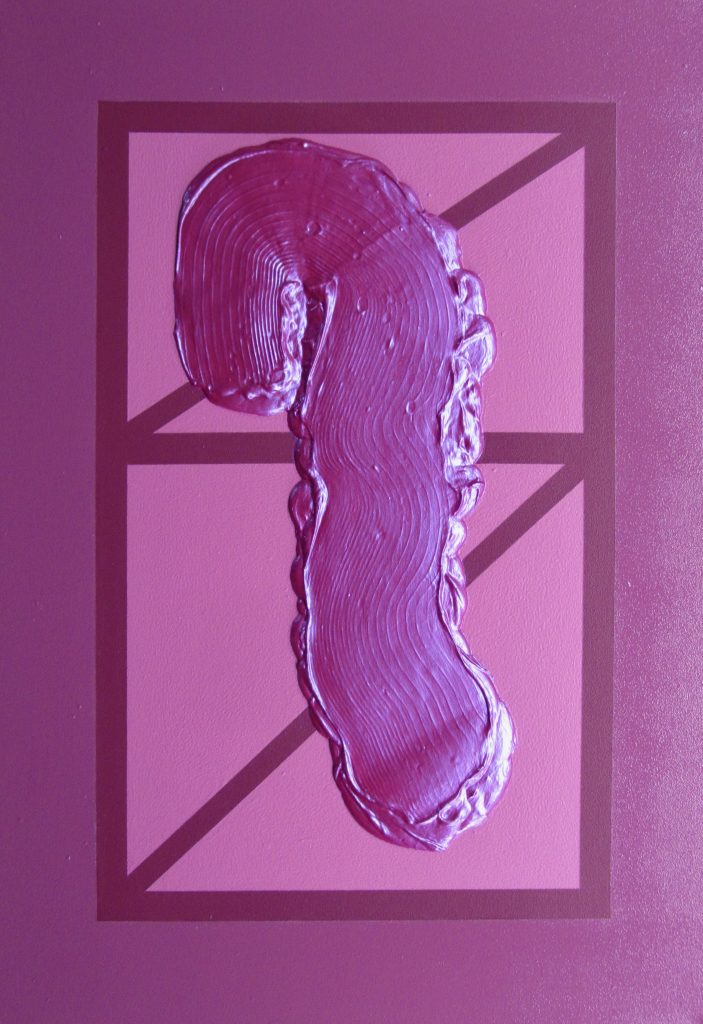 Fari and Varga Hosseini, Plum Hibiscus Wine (Magnolia Chaser) (2023), synthetic polymer paint, texture paste, gloss and satin varnish on canvas, 55.9 cm X 81.3 cm, collection of the artists.