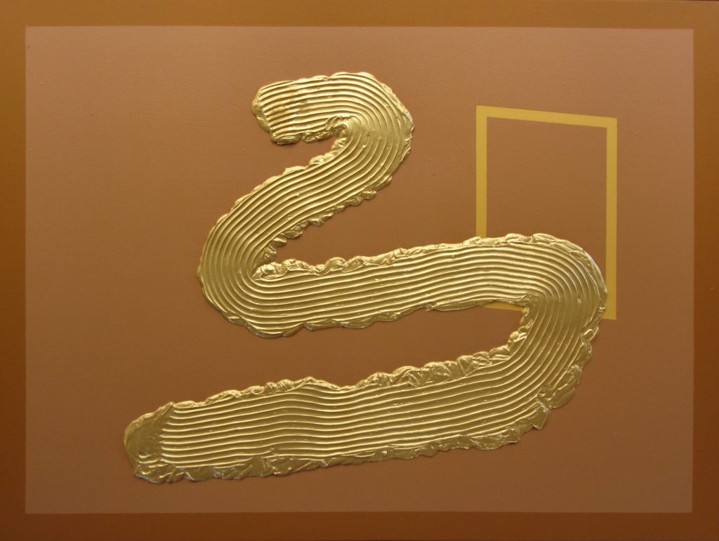 Fari and Varga Hosseini, Pale Gold Path (2024), synthetic polymer paint, texture paste, and gloss varnish on canvas, 91.4 cm X 121.9 cm, collection of the artists.